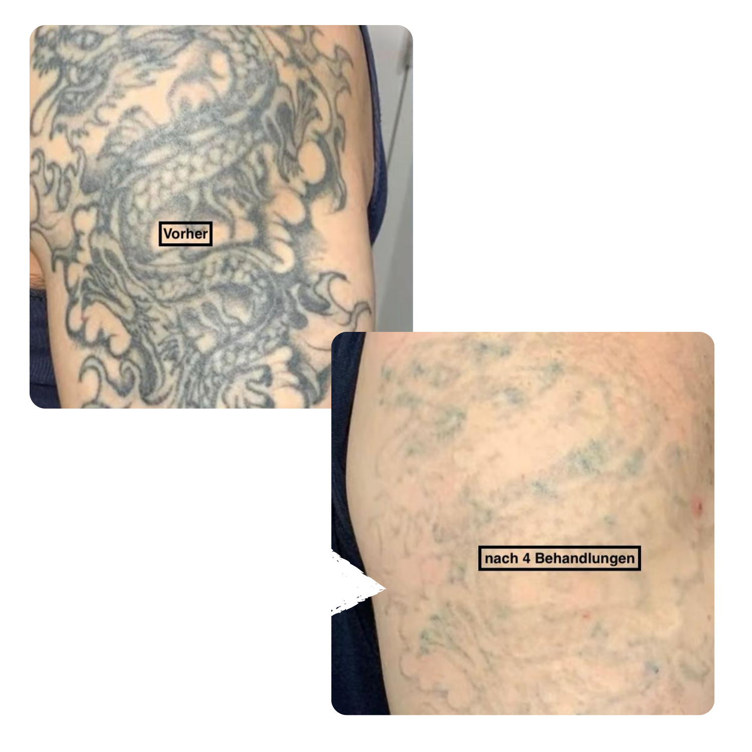 Je nach Größe und Farbe des Tattoos sind im Durchschnitt etwa 10 Behandlungen erforderlich, um das Tattoo vollständig zu entfernen. Die Haut regeneriert sich dabei zwischen den Sitzungen, sodass das Tattoo nach und nach verblasst und schließlich verschwindet. Dank des modernen Picolasers bleibt die Hautstruktur intakt und das Ergebnis wirkt natürlich und ebenmäßig.
